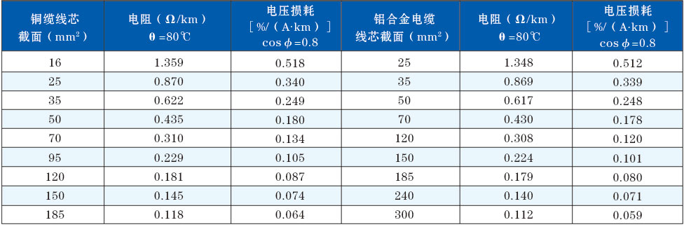 銅纜與鋁合金電纜電壓損失對比表