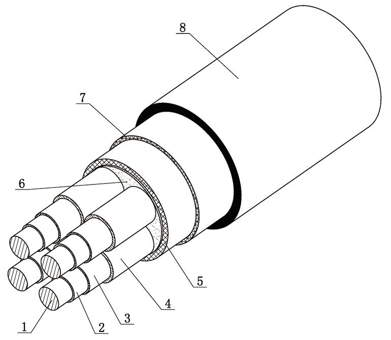 如圖1,一種帶有鋁合金隔離層的礦物質絕緣柔性隔熱防火電纜,是設有多個導體線芯1的多芯電力電纜;在每個所述導體線芯的外徑由內到外包裹有礦物質絕緣層2,鋁合金隔離層3,分色層4,多個包裹有絕緣層、鋁合金隔離層和分色層的所述導體線芯由一個礦物質防火隔熱層5包裹,在所述礦物質防火隔熱層與所述分色層之間的空隙填充有阻燃填料6,在礦物質防火隔熱層的外徑上包裹玻璃絲阻燃帶7,在所述玻璃絲阻燃帶的外層擠包有阻燃護套8。
