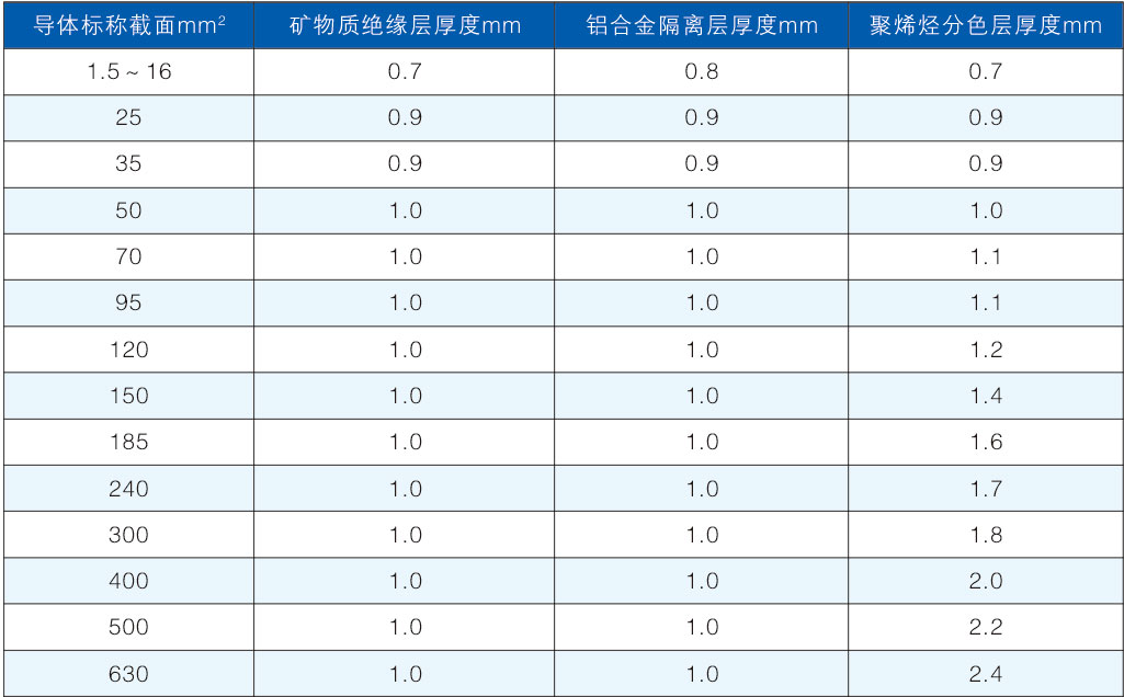 導體線芯的截面積、礦物質絕緣層厚度、鋁合金隔離層的厚度和分色層厚度的關系表如下: