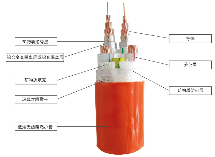 ①銅導體②金云母帶絕緣③鋁合金金屬套④交聯隔離套⑤Mg(OH)或Al(OH)耐火層⑥無鹵低煙聚烯烴外護套